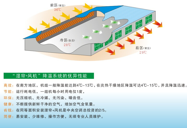 其降温换气通风作用,可有效处理工厂95%到99%的高温、热空气浑浊问题。它可以吹气排气质量有保证。是降温通风的选择。降温水帘是目前工业行业流行的,它的降温环保作用和省电作用是其他降温设备所没有的。